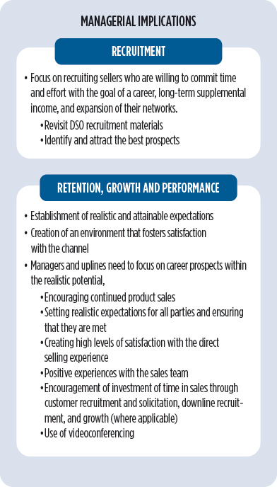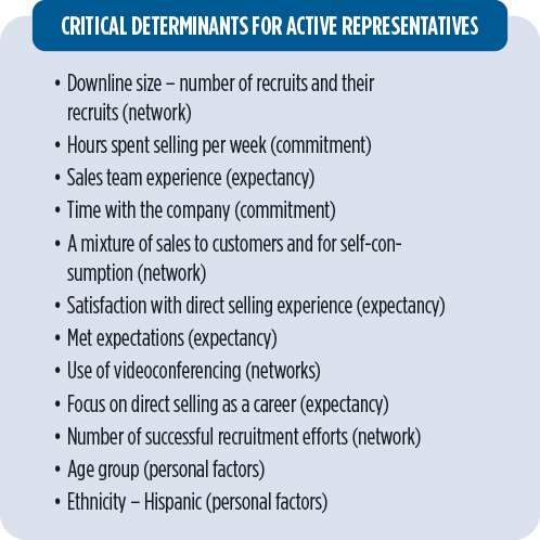 The factors identified are like those for salesforces and entrepreneurs. This is logical, considering that direct selling representatives operate as self-employed micro-entrepreneurs with intricately linked relationships to their direct selling companies.
