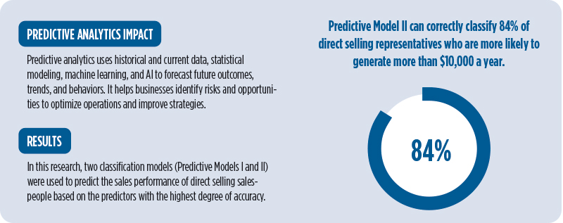 This can assist companies to focus on factors that most significantly contribute to the financial success of direct selling representatives to lead to increased company growth and performance. By using a Bootstrap Forest technique, we show that Predictive Model-II can correctly classify 84% of representatives who are more likely to generate more than $10,000 a year. DSOs can develop organizational training and support based on this knowledge.