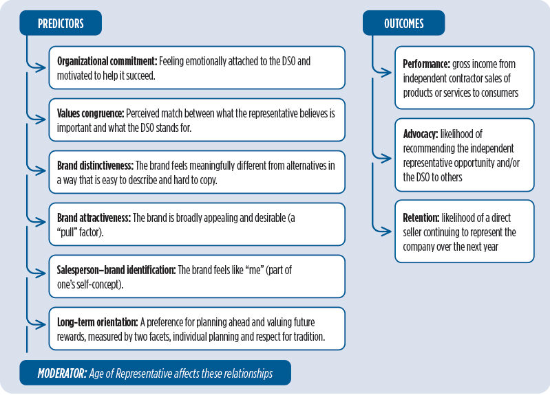 Direct selling depends on independent representatives who choose to stay, advocate for the opportunity, and help grow the salesforce. Because representatives are not traditional employees, direct selling organizations (DSOs) often win or lose on perceived fit and meaning between the representative and the company, rather than formal supervision. We examined whether identity-related perceptions, such as commitment, shared values, identification, brand meaning and long-term orientation, help to explain three practical outcomes of income, willingness to recommend the DSO/direct selling to others, and likelihood of continuing as a representative.