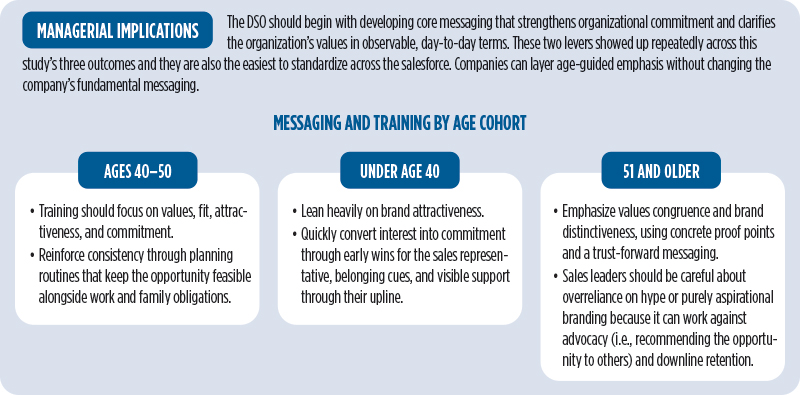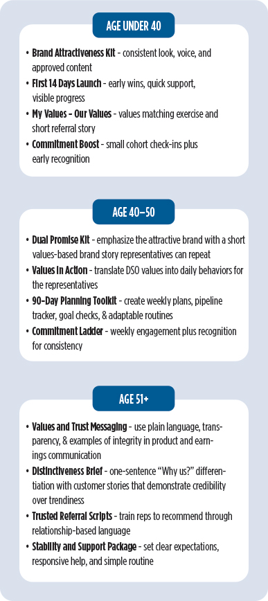 In Figure 2, we illustrate how the DSO can layer age-guided emphasis without changing the company’s fundamentals. Under 40 messaging and training could lean more heavily on brand attractiveness while quickly converting interest into commitment through early wins for the sales representative, belonging cues, and visible support through their upline. For ages 40–50, training might intentionally combine values fit, attractiveness, and commitment, then reinforce consistency through planning routines that keep the opportunity feasible alongside work and family obligations. For 51 and older, the emphasis could shift toward values congruence and brand distinctiveness, using concrete proof points and a trust-forward message; in this group, leaders should be careful about overreliance on hype or purely aspirational branding because it can work against advocacy and retention.