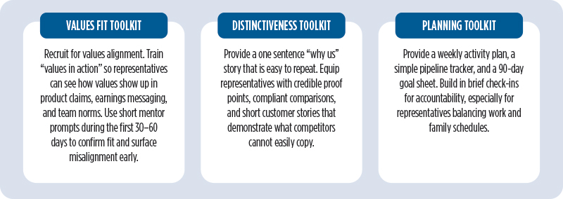 In Figure 3, we propose an overall toolkit architecture that DSO managers and leaders can use in coaching, communications, and recognition. The first toolkit could be a values fit toolkit that includes brief screening prompts during recruiting, a “values in action” onboarding module that shows how values appear in product claims and team norms, and mentor check-ins that surface misalignment early. The second toolkit could be a distinctiveness toolkit that gives representatives a one-sentence “why us” statement, compliant comparisons, and customer stories that make the brand’s difference easy to explain and hard to copy. The third toolkit could be a planning toolkit that provides weekly activity plans, 90-day goals, and pipeline tracking, especially for the 40–50 segment where planning aligned with continuation.